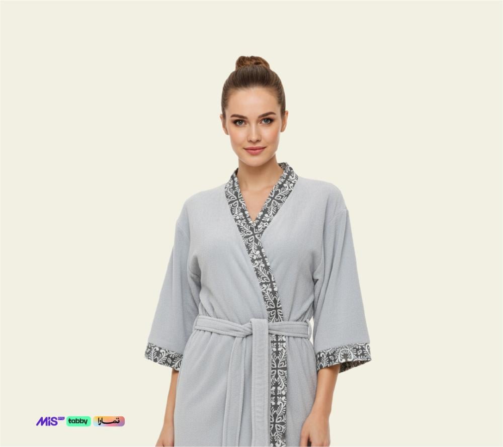 يمنحك لونه الرصاصي الجذاب مظهرًا راقيًا يعكس الذوق العصري، بينما تضيف الحافة المزخرفة لمسة من التميز تجعله خيارك الأمثل للاسترخاء بعد الاستحمام أو في لحظات العناية الذاتية.