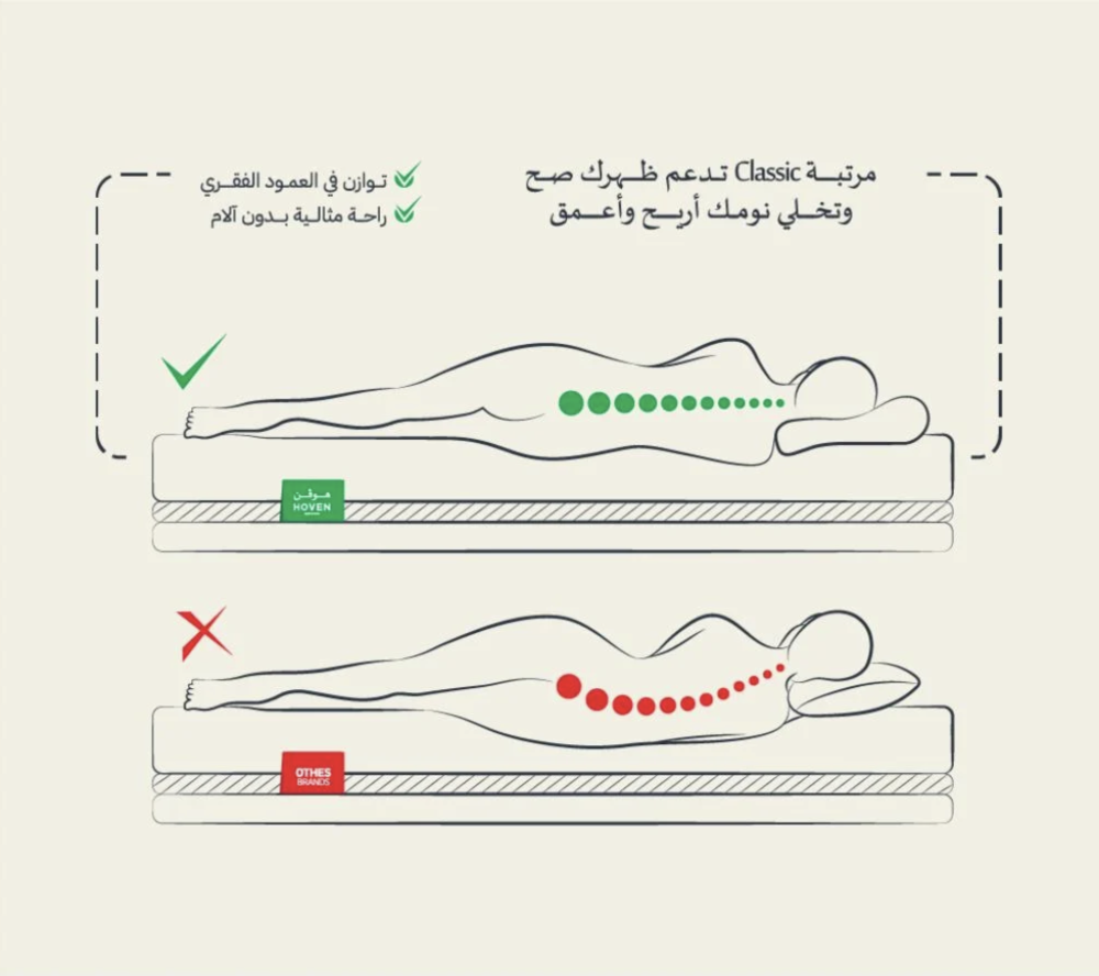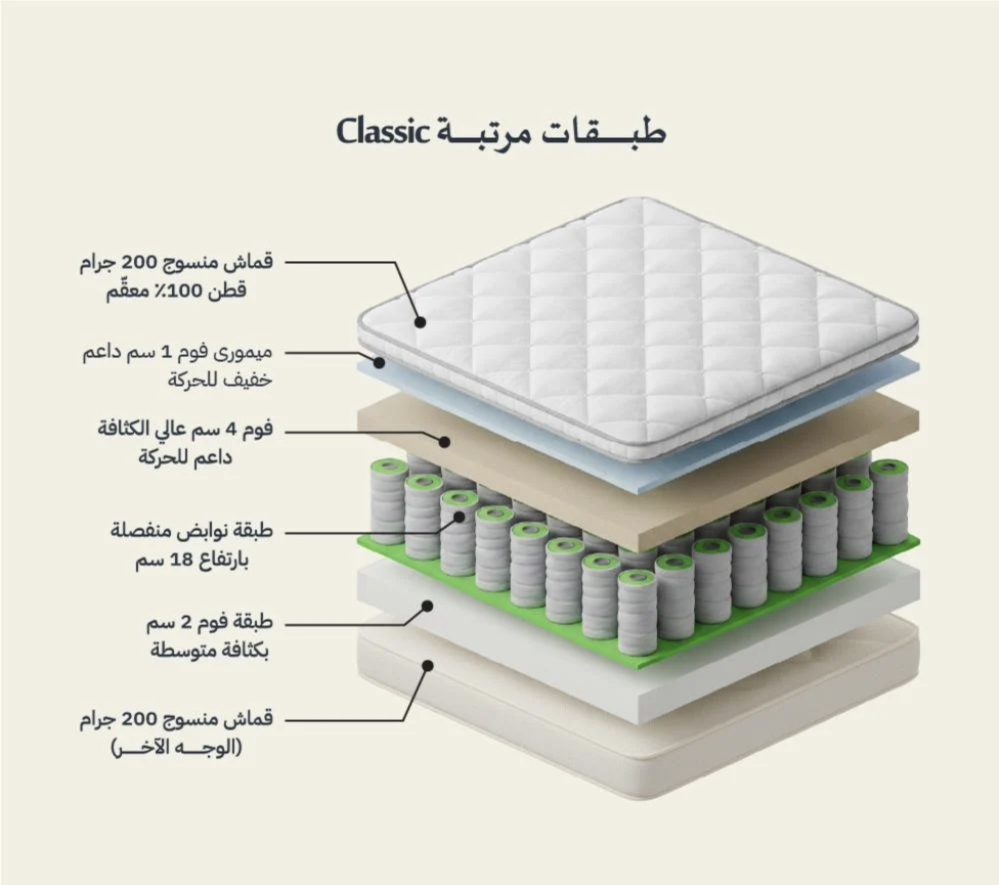 ✔️ مرتبة كلاسيك – دعم متوازن للظهر والعمود الفقري، مثالية لنوم صحي وعميق