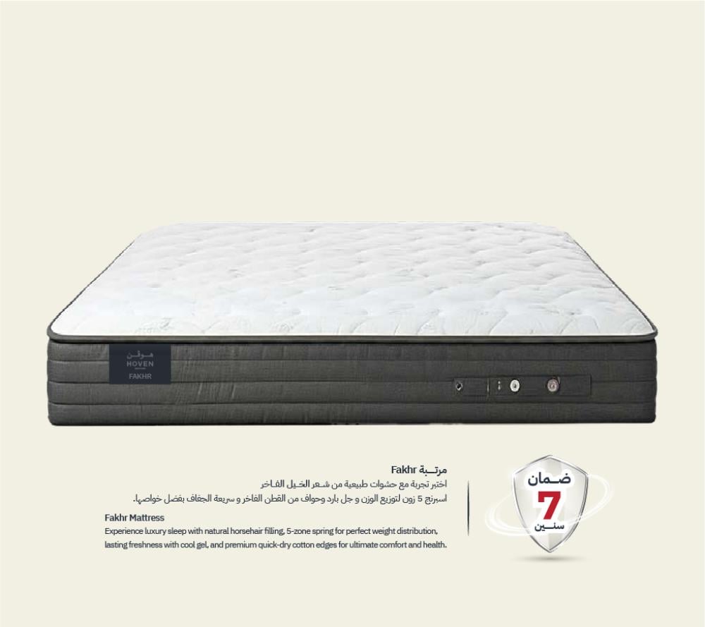 Fakher Mattress – Nature’s Luxury for Unmatched Comfort Indulge in the finest sleep experience with the Fakher Mattress from HOVEN — crafted with 100% natural materials, a luxurious 40 cm height, and spacious 200×200 cm dimensions to provide deep, restorative rest every night.