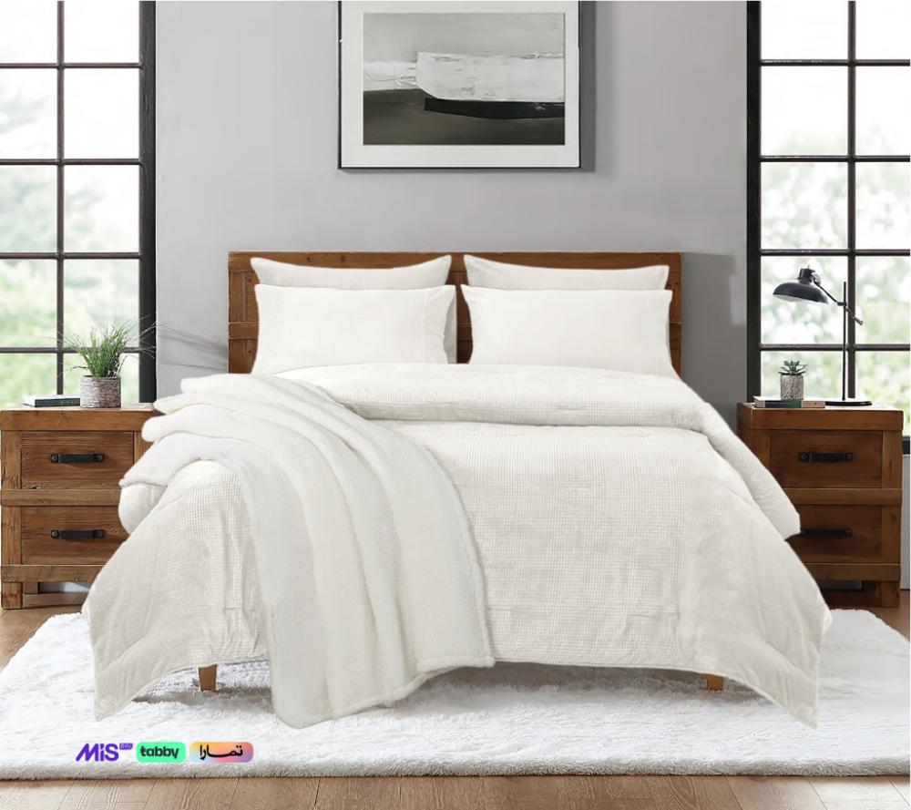 امنحي غرفة نومك لمسة صفاء وأناقة 冬ية لا تقاوم مع مفرش هينيمو الشتوي نفر ونص – أبيض – طقم 5 قطع المصنوع من المخمل الدبل فيس الفاخر الذي يجمع بين النعومة المخملية والدفء العميق. يأتي اللون الأبيض ليمنح غرفتك مظهرًا راقيًا ونظيفًا، ويضيف إشراقة فندقية تمنح السرير حضورًا مميزًا يعكس الذوق الرفيع.